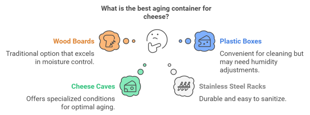 Each type of container has its advantages and is suited to different types of cheese and aging methods. For example, wood boards are often used for traditional hard cheeses, while plastic boxes might be preferred for softer cheeses that require higher humidity.