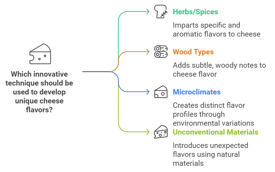 Innovative cheese makers are constantly exploring new ways to develop unique flavors in their cheeses. Some experimental techniques include: