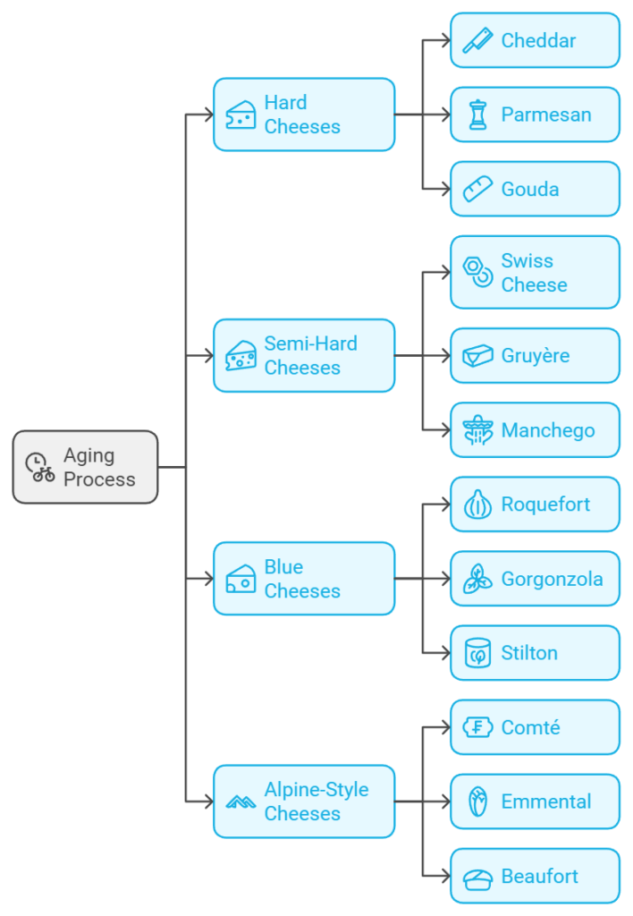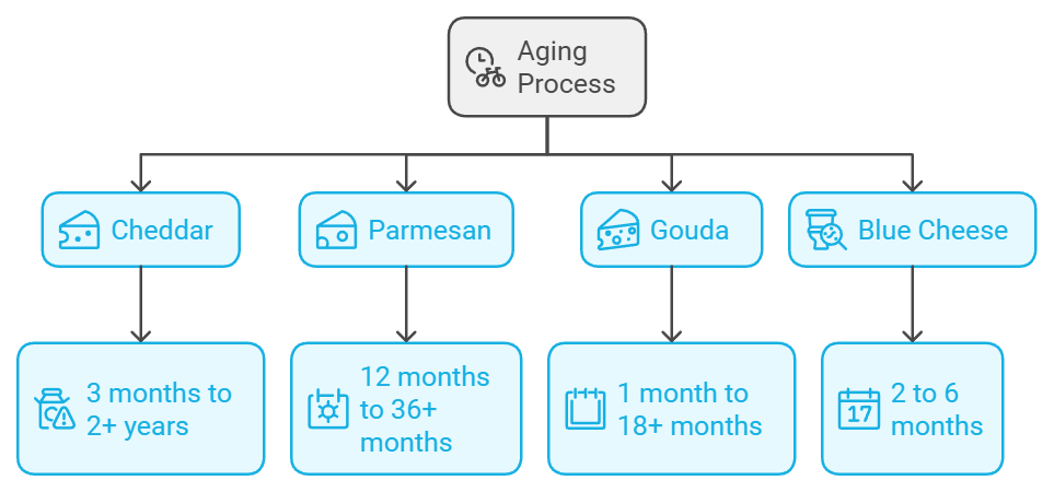 Aging Duration | Varies from weeks to years depending on cheese type | Traditional aging vs. accelerated aging methods | Regular monitoring and maintenance necessary |