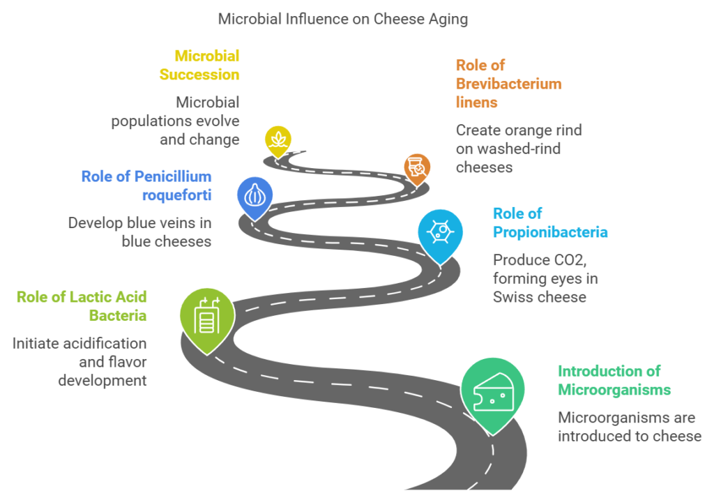 The community of cheese microbes evolves throughout the ripening process, with different species becoming dominant at various stages. This succession of microbial populations is a key aspect of cheese ripening and significantly influences the final characteristics of the cheese.