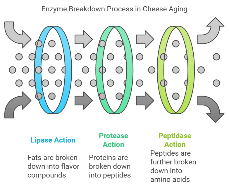 The use of these enzymes can significantly speed up the development of flavor compounds in the cheese, reducing the required aging time.