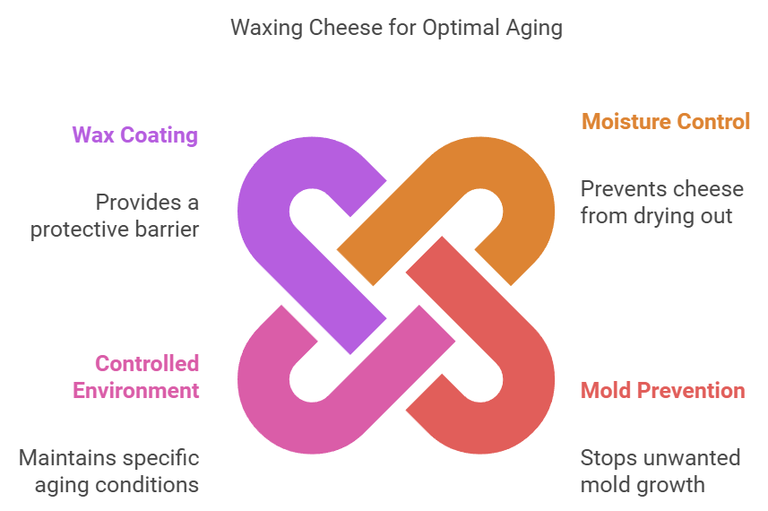 Wax Coating and Controlled Environment | Coating cheese with wax in controlled aging rooms | Cheeses like Gouda and some Cheddars | Controls moisture loss, prevents unwanted mold |